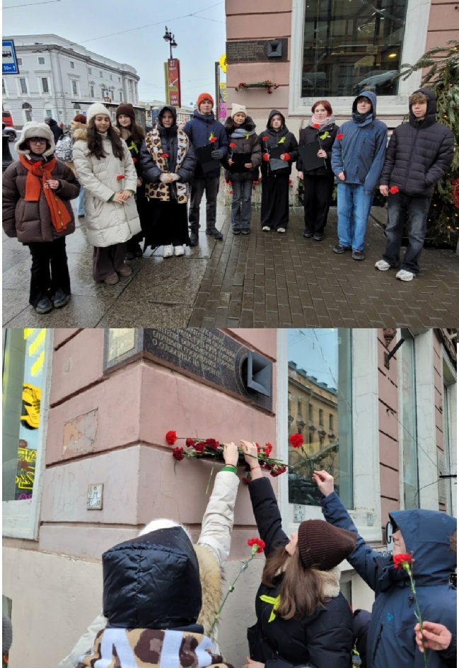 Ученики 8 б класса провели сегодня памятную акцию у исторического места — «Блокадного репродуктора» на пересечении Малой Садовой улицы и Невского проспекта. Ребята возложили цветы и рассказали о том, как именно здесь, в самые тяжёлые дни блокады, ленинградцы собирались, чтобы слушать Ленинградское радио.